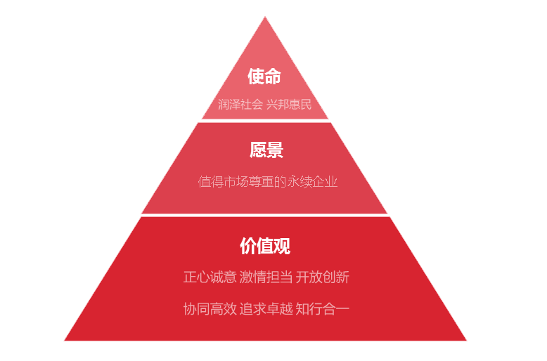 为客户创造价值,提供超越客户期待的产品;为员工创造机会,帮助员工成长和成功;为社会承担责任,推动社会和谐发展;为国家贡献力量,实现祖国兴盛富强。